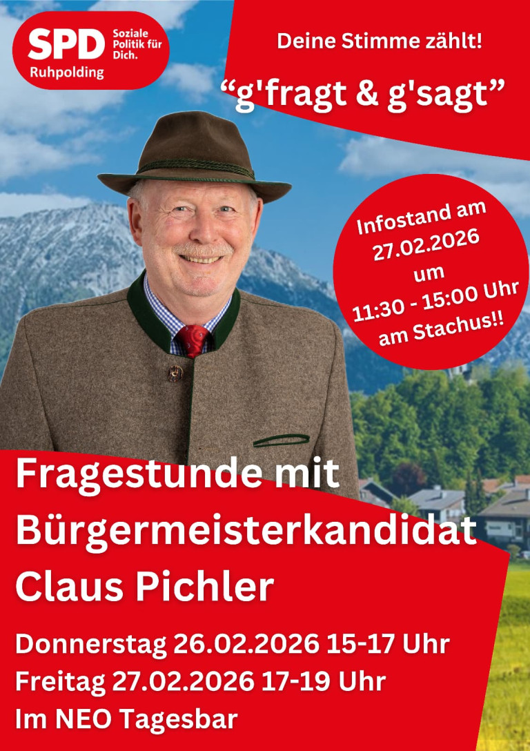 Claus Pichler sieht die Wahl als neue Chance, da fünf Kandidatinnen und Kandidaten für das Bürgermeisteramt die Stimmung im Dorf widerspiegeln. Er möchte mit dem überzeugen, was er bietet. Er stellte zudem heraus, dass der Bürgermeister selbst auch nur eine Stimme hat und immer mit dem Gemeinderat zusammenarbeiten muss. Der Gemeinderat wird sicher bunter und vielfältiger werden. Darin sieht er eine große Chance für Ruhpolding.